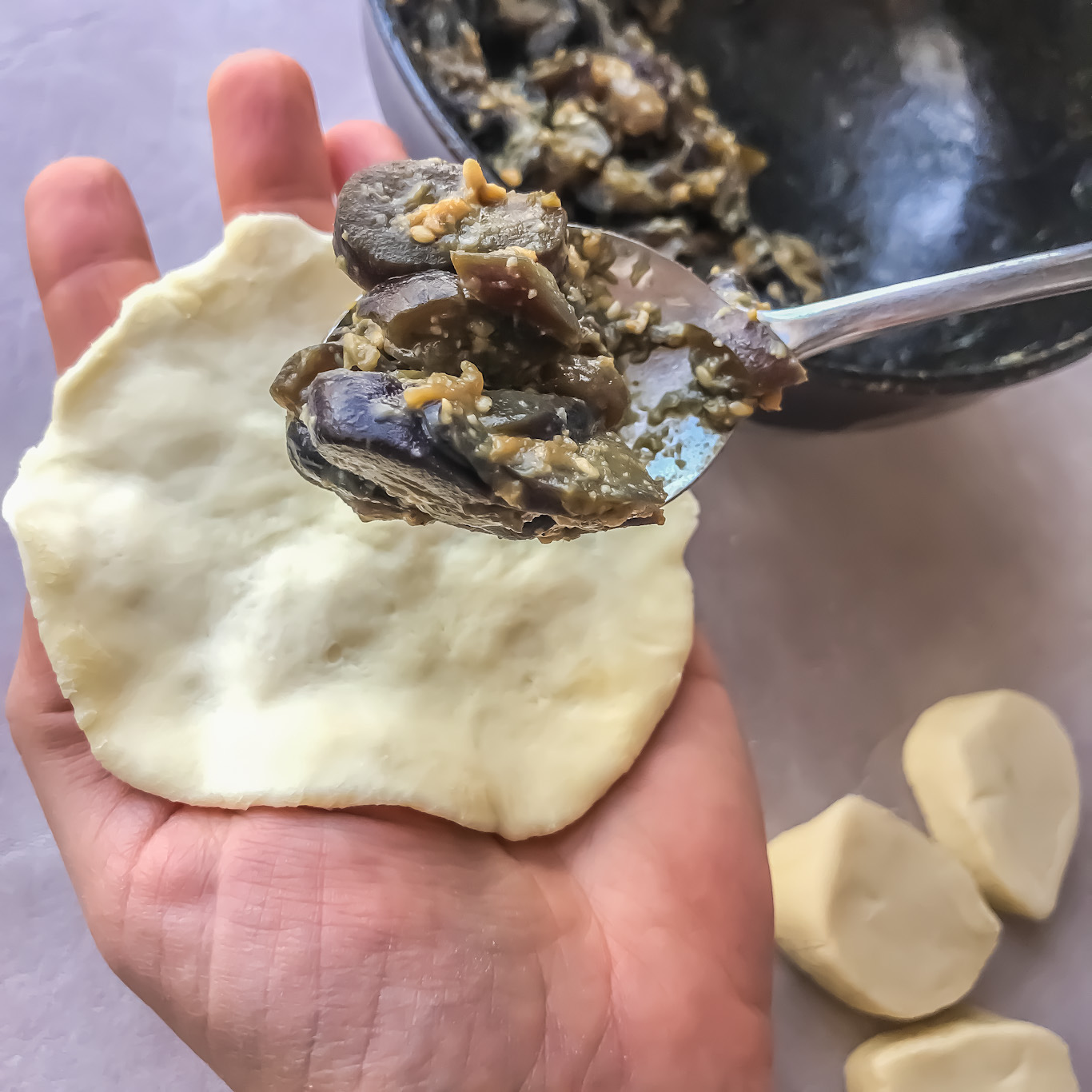 • שמים כף גדושה של מילוי החצילים במרכז וסוגרים את עיגול הבצק. יש הרבה דרכים לסגור את האויאקי. אני אוהבת את השיטה של חצי מול חצי ואז סגירת הרבעים (ראו בתמונות), אבל אם תחפשו ביוטיוב אני בטוחה שתמצאו שלל דרכים אחרות.